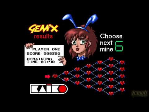 Gem'X is a puzzle game in the strangely prolific vein of wannabe-japanese looking german games. As such it is not really authentic in its look and feel but it is nonetheless very well designed, playable and addictive. A password saving system and 2 fire button controls are very welcome bonuses here. I feel it would have been much better if no fake manga aesthetics were involved at all, but as it is Gem'X is a very nice puzzler for the Amiga (7/10).